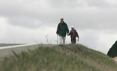 Un peregrino del Camino de Santiago observa el aumento del caudal del rio a su paso por Trinidad de Arre